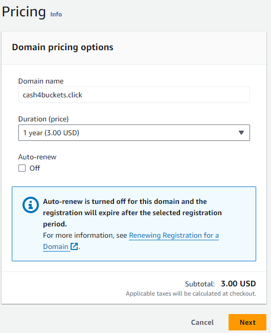 Here you can choose any domain you want and add it to your cart. I’ve gone with cash4buckets.click - .click because it’s cheap! Remember to un-check Auto-Renew, unless you want that on.