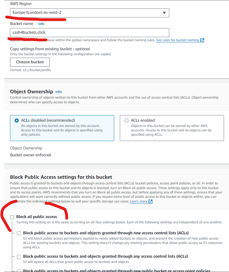 Navigate to S3 and hit “create bucket“ - give your bucket the same name as your domain “cash4buckets.click“ and select a region near you. Next, we need to un-check Block all public access, which is on by default. Leave everything else on this page as default - although it’s worth spending time understanding the options, especially KMS keys 😉 Your page should now look like this: