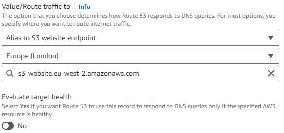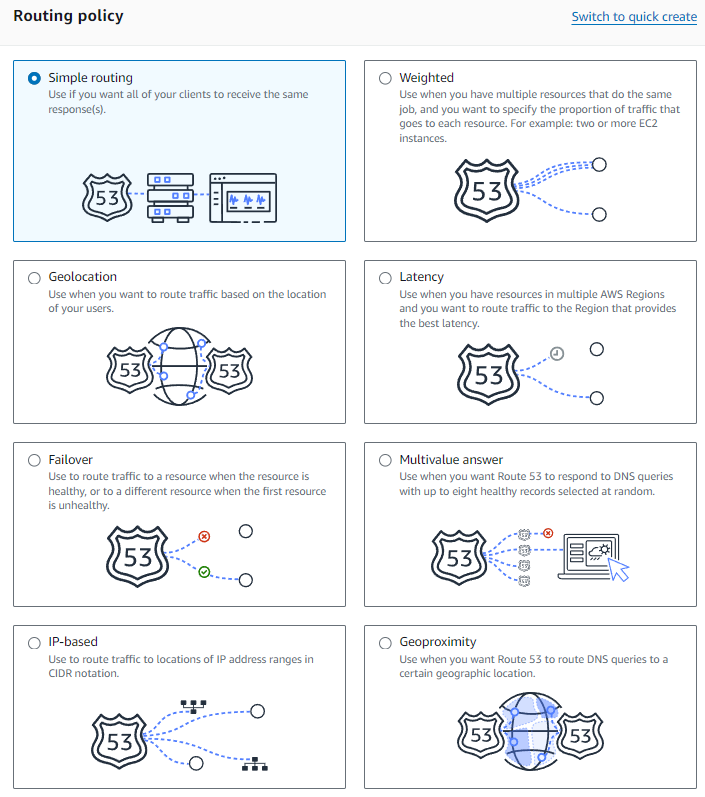 Back in Route 53, select your hosted zone and “Create Record” you might have to click “Switch to wizard” here to get the Routing policies to show. Go ahead with “Simple routing”, seriously, it’s worth stopping here and reading them all if you’re studying towards the AWS SAA exam.