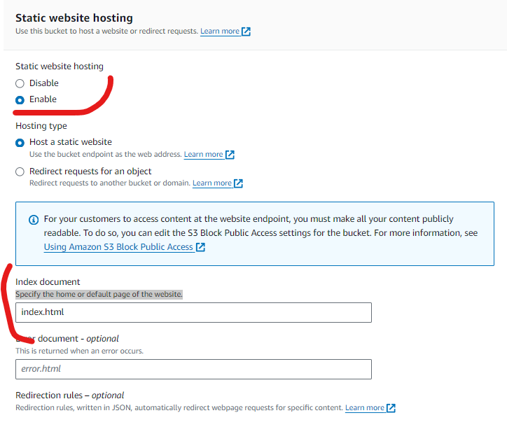 Now you’ve created your bucket and domain we need to enable static website hosting. This can be configured at the bottom of the “properties” tab on your main bucket page. Select “Enable” and type “index.html” in the Index document box - “Specify the home or default page of the website.”