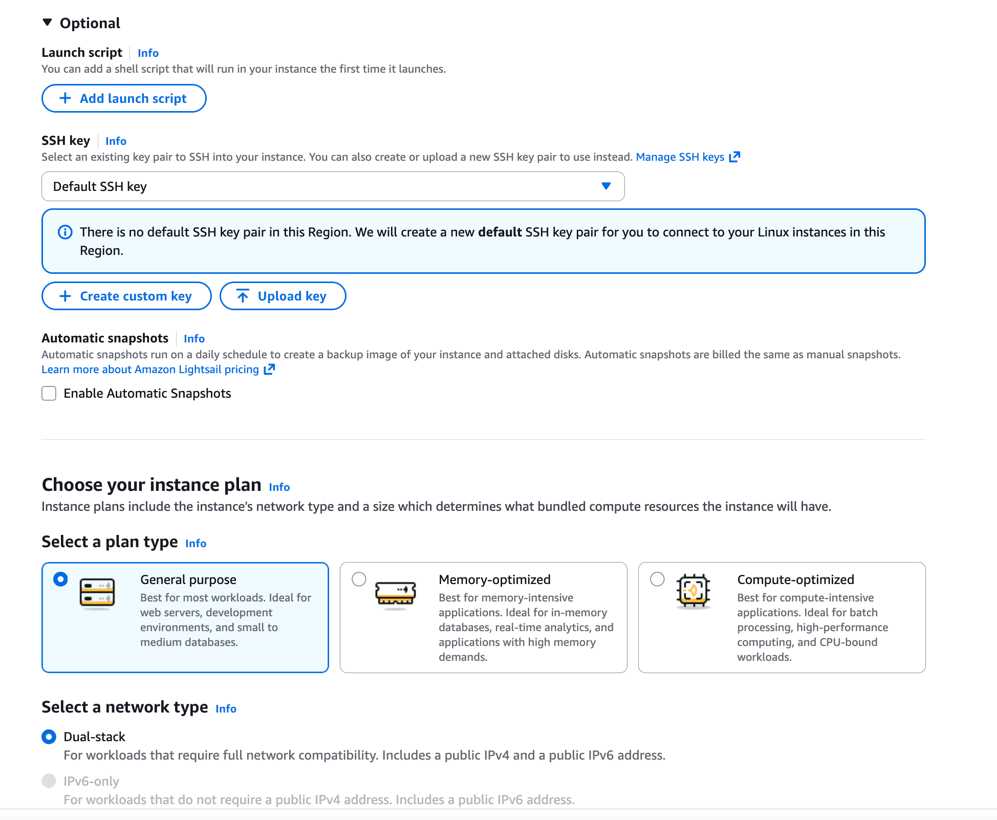 Stick with General purpose here and upload an SSH Key (Or make one)
